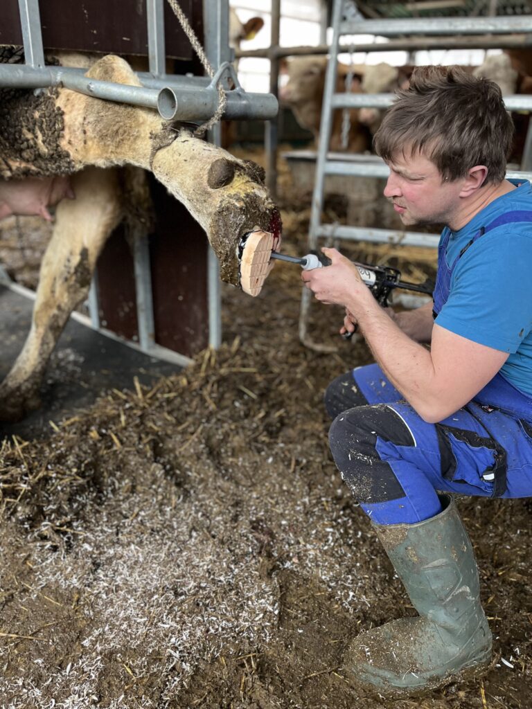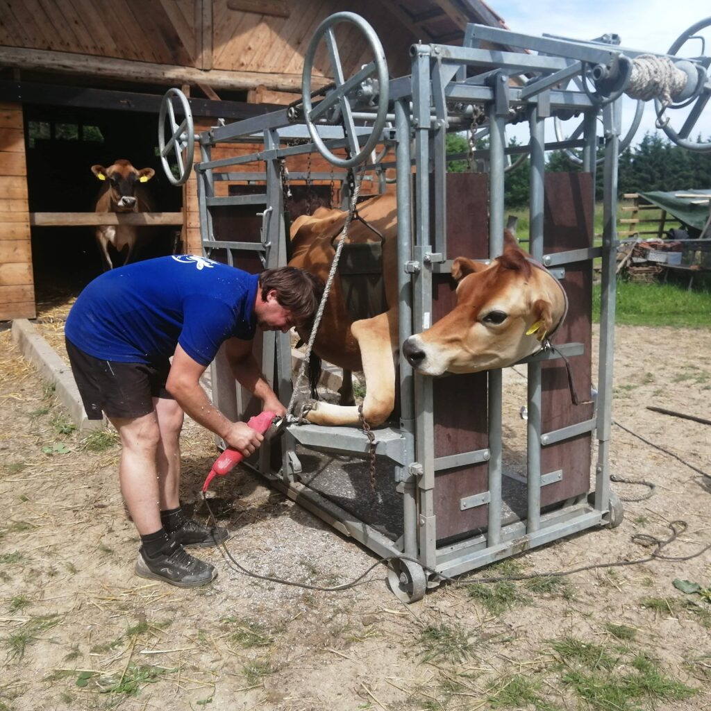 Paznehtářská péče pro skot: zahrnuje vlastní klec pro pohodlné ošetření a specializované postupy pro léčbu kulhání a aplikaci obvazů.